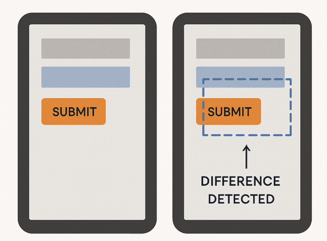 Visual testing compares how your app looks over time. The tool takes a screenshot of the UI (called a baseline) and compares future versions of the screen to it. If even a single pixel shifts, it gets flagged.